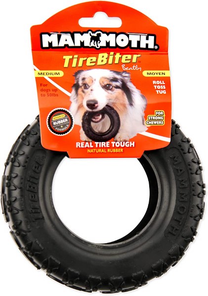 Keep the good times rolling with Mammoth’s Tirebiter II Dog Toy! This heavy-duty toy is crafted with a new advanced natural rubber material to help it stand up to even longer-lasting play. Mammoth Tirebiter toys are sustainably manufactured in a North American factory and proudly designed and developed in the USA with USA materials. They are also designed with a progressive chew system, which means your pup will slowly start to gain strength as he works his way up in toy size! Roll, toss or tug the tire to encourage interactive play and keep your canine companion engaged and encourage healthy exercise.
